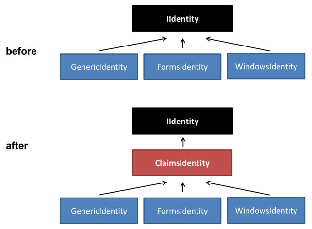 But it is more than simply merging assemblies; in fact claims are now a first class citizen in the whole .NET Framework. All built-in identity classes, like FormsIdentity for ASP.NET and WindowsIdentity now derive from ClaimsIdentity. Likewise all built-in principal classes like GenericPrincipal and WindowsPrincipal derive from ClaimsPrincipal. In other words, the moment you compile your .NET application against 4.5, you are claims-based. That’s a big (and excellent) change.
