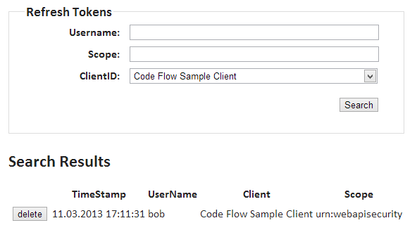 Also note the tokens link at the bottom which brings you to the refresh token search page where you can (based on different search criteria) view and delete refresh tokens:
