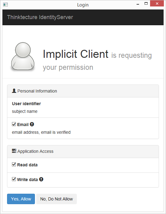 We are not done yet – but will have more details soon – in the meantime – here’s a preview screenshot of a consent screen for a native client requesting identity claims (user id and email) as well as access tokens for an HTTP API backend.