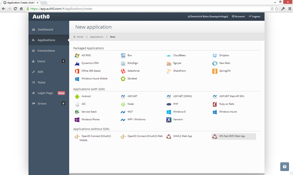 Auth0 has support for many pre-packaged application types like Salesforce, Office 365 or SharePoint. Since AS is a WIF-based application, I chose WS-Fed (WIF) App.