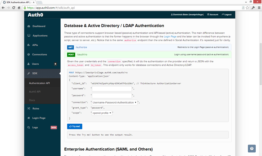 For supporting the OAuth2 resource owner password flow, AS needs programmatic access to the Auth0 authentication endpoint. That’s easily possible too, and via the excellent documentation system, you can inspect the relevant endpoint as well as a sample payload.