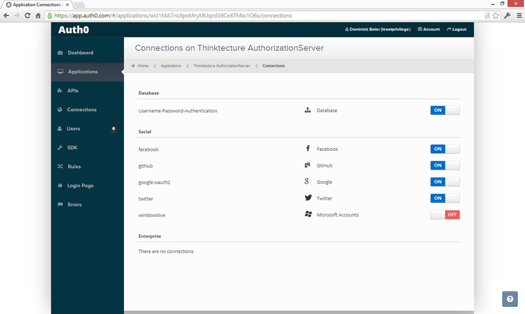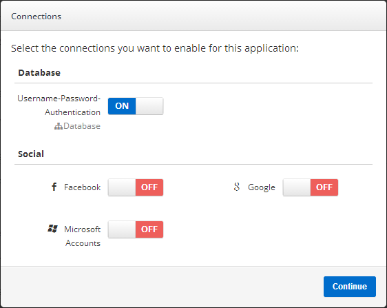 Next, you can choose which identity providers or account types you want to allow for your new application (Auth0 calls that connections). I decided to start with local accounts only, and to add other connections later once I have the basic setup up and running.