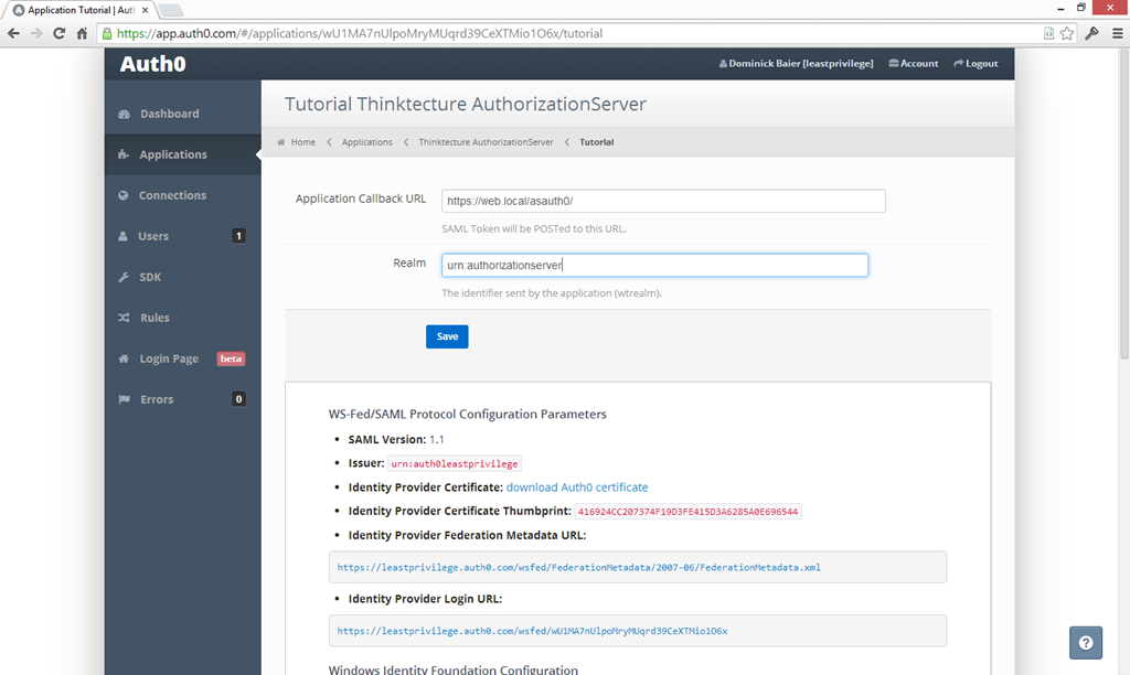 Since Auth0 already gave me a ready to use federation configuration, I only had to copy that over to the identityModel.config and identityModel.services.config files (in the config folder) respectively. Then I ran the initial configuration “wizard” and entered the user ID of the admin account I created earlier.